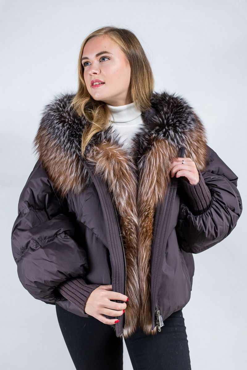 Стильная, теплая, объемная куртка-пуховик цвета “баклажан”, с наполнителем из стопроцентного натурального пуха, с опушкой из меха лисы.