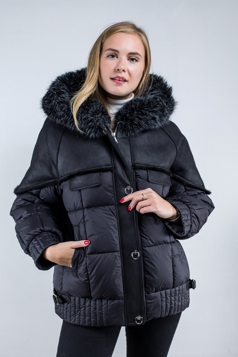 Стильная, теплая, комбинированная куртка с капюшоном и застёжкой на молнию. Кокетка выполнена из экомеха, спинка и перед- из плащевки с наполнителем “биопух”. Теплый, уютный капюшон отделан экомехом “песец”