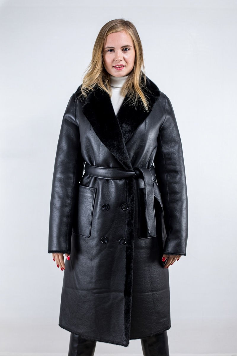 Мягкая, уютная, теплая, двусторонняя экодубленка прямого силуэта с плотным мехом и покрытием “силка”. Универсальная модель с “английским” воротником и накладными карманами.
