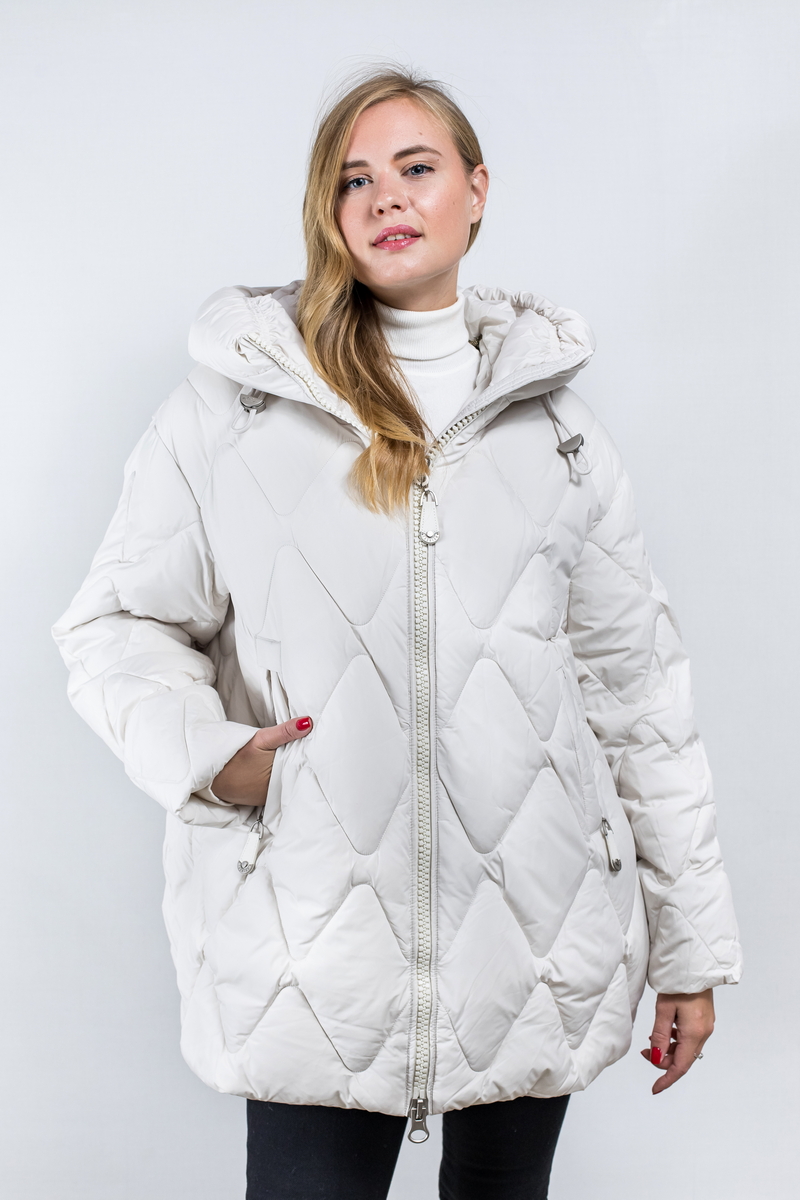 Теплая куртка- пуховик свободного кроя с наполнителем “биопух”. Удобный капюшон, оригинальная строчка “ромб”
