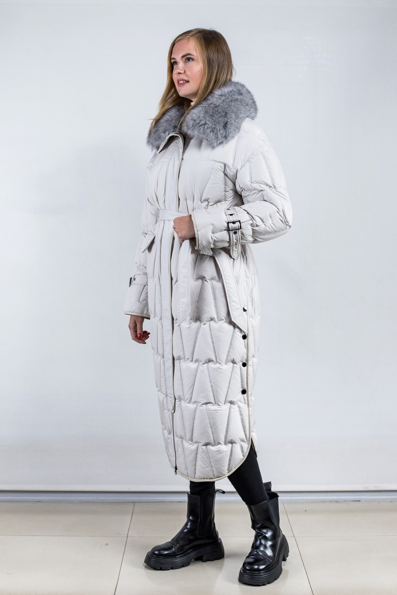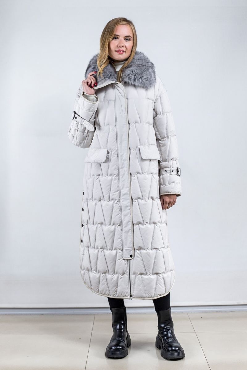 Длинный, стильный пуховик прямого силуэта, со съёмным воротником из натуральньго меха песца. Эффектная стёжка, наполнитель- натуральный пух!